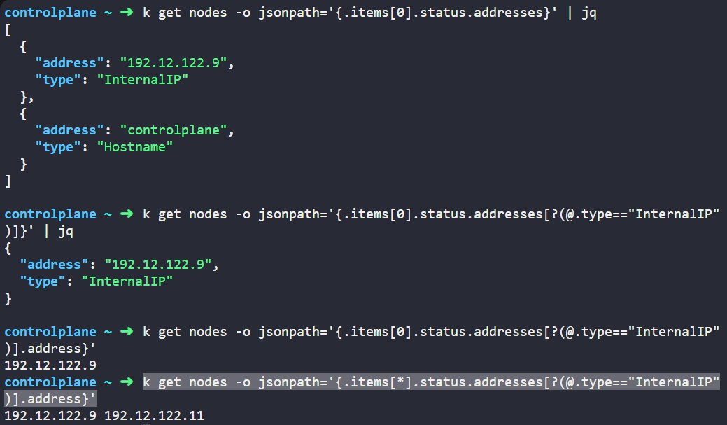 경로를 입력하면 데이터를 추출함k get nodes -o jsonpath='{.items[*].status.addresses[?(@.type=="InternalIP")].address}'